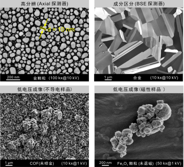 扫描电镜SEM:(1)该电镜配置4种探测器,可以根据样品特征和需求选择不同的信号进行采集,能够满足不同技术领域材料的高分辨(0.9 nm@15 kV)成像需求;(2)该电镜采用镜筒内电子加速、减速技术,可实现不导电样品在低电压下的高分辨( 1.2 nm@1 kV)成像;(3)该镜筒配置静电-电磁复合物镜,可实现磁性样品(无需退磁处理)高分辨成像及分析。