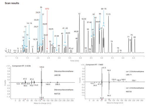 图1 饮用水中80种挥发性有机物标准品总离子流图(上)及NIST匹配图(下)