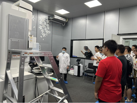 平台技术团队李雷博士、李昕翼博士、张燃博士分批带领同学们陆续参观了扫描电镜、透射电镜、冷冻电镜、核磁共振波谱仪、X射线光电子能谱仪拉曼光谱仪等大型仪器详细介绍了各种仪器的基本原理和样品制备方法,并根据同学们目前的知识基础,有针对性地进行了演示和举例,展示了各种仪器设备在物质微观世界观察上的不同功能。