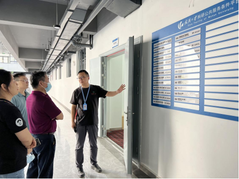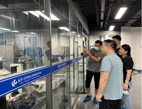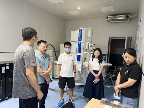 电气学院领导一行参观了平台的各个大型仪器设备机组,平台支部书记周晓东教授详细讲解了扫描电镜、透射电镜、冷冻电镜、核磁共振波谱仪、X射线光电子能谱仪等设备的基本原理和使用情况。