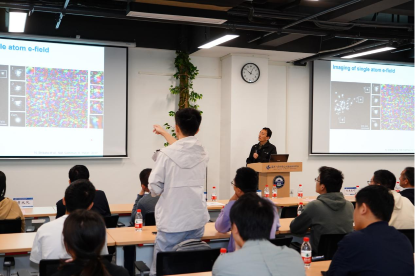 仪式结束后,苗澍老师做了题为《JEM-ARM300F2功能简介》的主题报告,为大家介绍了与300 kV双球差校正透射电子显微镜GRANDARMTM2相关的具有国际前沿技术水平的功能。其中包括在TEM中实现超高分辨的二次电子像、分段环形全场探测器(SAAF)、4D STEM 以及Electrostatic Dose Modulator(EDM)等先进技术的进步,并就相关案例与在场的专家同行进行了深入交流。