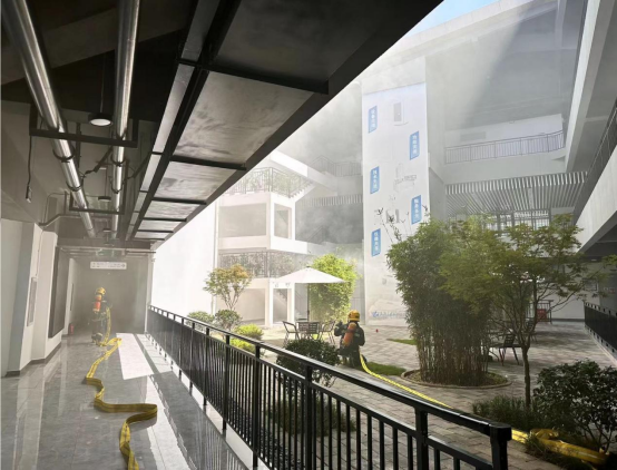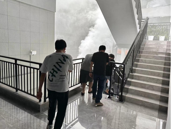 下午2点半,演习正式开始。随着烟雾弹拉开,尖端科技楼内部浓烟滚滚,火警警报响起,在工作人员的引导下,楼内所有人员用湿毛巾掩住口鼻,按照指定疏散路线迅速有序地撤离警情后,武汉市公安消防支队洪山区大队八一路中队迅速赶赴现场,出动消防车进入火场控制火势,整个演练过程组织严密、协调配合、有条不紊,达到了预期效果。