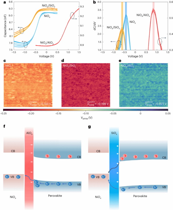 1. 本研究利用原子力显微镜SPM-9700HT KPFM表明了NiOx、SiOx和AlOx薄膜的KPFM电压(VKPFM)(图1c-e),图2、3(补充图18、22)表征了原子力显微镜形态,图4(补充图23)展示了VKPFM的分布,说明AlOx样品的平均VKPFM高于NiOx。并且SiOx样品的平均VKPFM较低,为- 0.198 V。KPFM结果进一步强化了界面处固定电荷的存在。