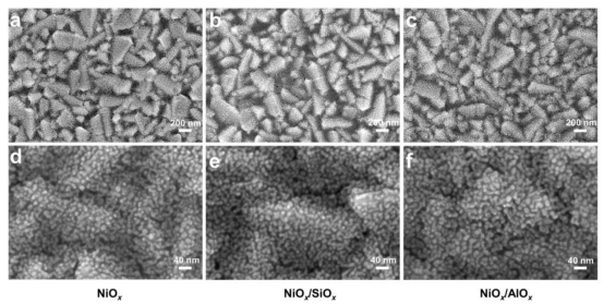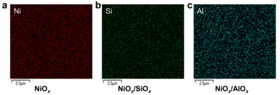 2. 使用场发射扫描电镜ZEISS GeminiSEM 500以及能谱仪表征了FTO/NiOx、FTO/NiOx/SiOx和FTO/NiOx/AlOx薄膜的SEM俯视形貌图(图5)。并给出了元素组成分布(图6)。