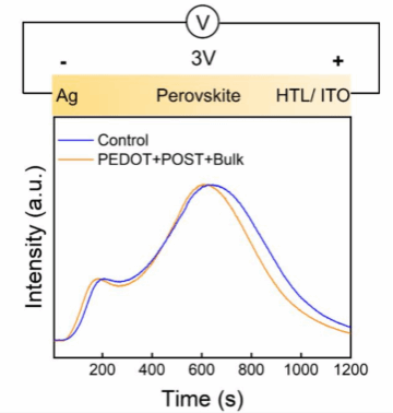 本研究通过将手性天冬氨酸盐酸盐(AspCl)分子掺入底部聚(3,4-乙烯二氧噻吩)-聚(苯乙烯磺酸盐)PEDOT:PSS(PEDOT)、中间钙钛矿吸光层(Bulk)和顶部封盖层(POST)中,并进行AspCl后处理,开发了一种Sn-Pb PSCs的一体化掺杂方法。有效提升了单结Sn-Pb钙钛矿太阳能电池及其串联的效率和稳定性。