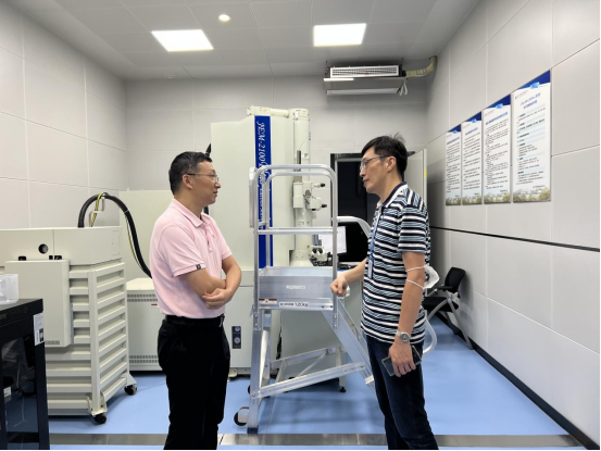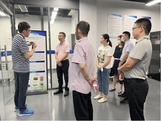 王建波向支部一行详细介绍了平台的建设过程、仪器调试安装、运行机制、仪器购置流程以及支撑服务开展等情况。支部党员们参观了拉曼光谱仪、X射线衍射仪、核磁共振波谱仪、扫描电镜、透射电镜、冷冻电镜等平台各项大型仪器设备,周晓东对仪器的基本原理以及典型应用领域进行了逐一的介绍。