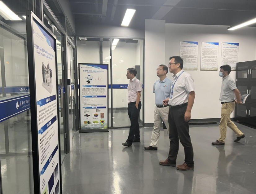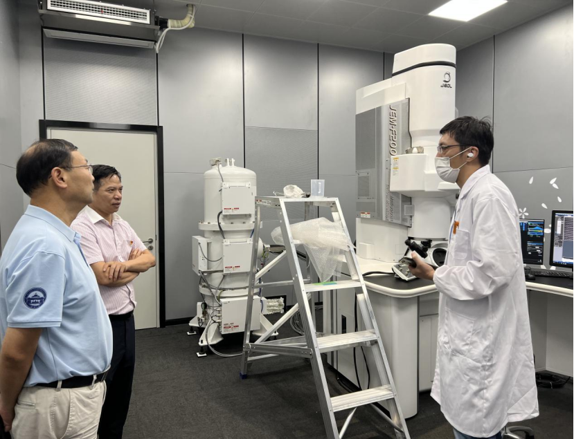 应志豪向支部一行详细介绍了平台的建设过程、仪器安装调试、技术团队、主要仪器设备以及支撑服务开展等情况,并陪同支部党员们参观了平台各项大型仪器设备。周晓东详细介绍了扫描电镜、透射电镜、冷冻电镜的基本原理和应用范围。党员同志们现场观看了双球差透射电镜的送样过程,并就平台自主上机方式、实验室管理制度、环境要求、软件信息等问题与平台老师进行了探讨。