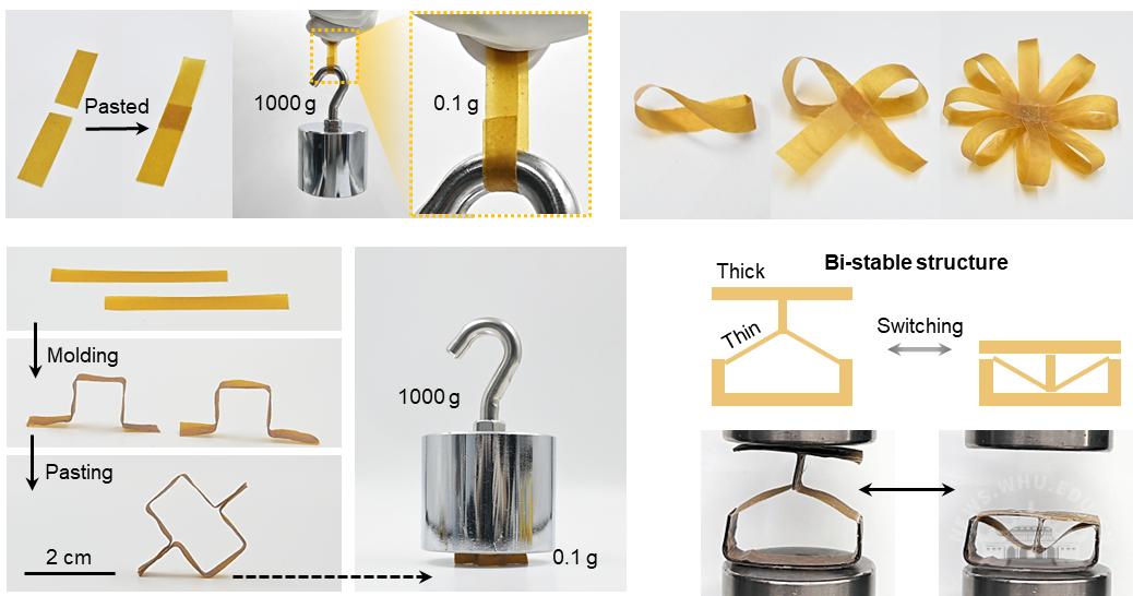 GPa,可媲美甚至超越目前主流的可降解塑料材料(如PBS、PBAT、PLA)及部分石油基塑料(如ABS、PET)。不仅如此,该材料天然具备绿色的“水加工性”,无需复杂分子设计,仅凭最常见的水,就能实现材料的多维度塑形、拼接和重复加工。这种简便、绿色的加工方式为个性化定制与复杂结构成型(如包装、医疗器具等)提供了便利,同时有效避免了传统加工方式中高温或化学粘合剂带来的资源浪费与环境风险。相关成果发表在《科学进展》(Science