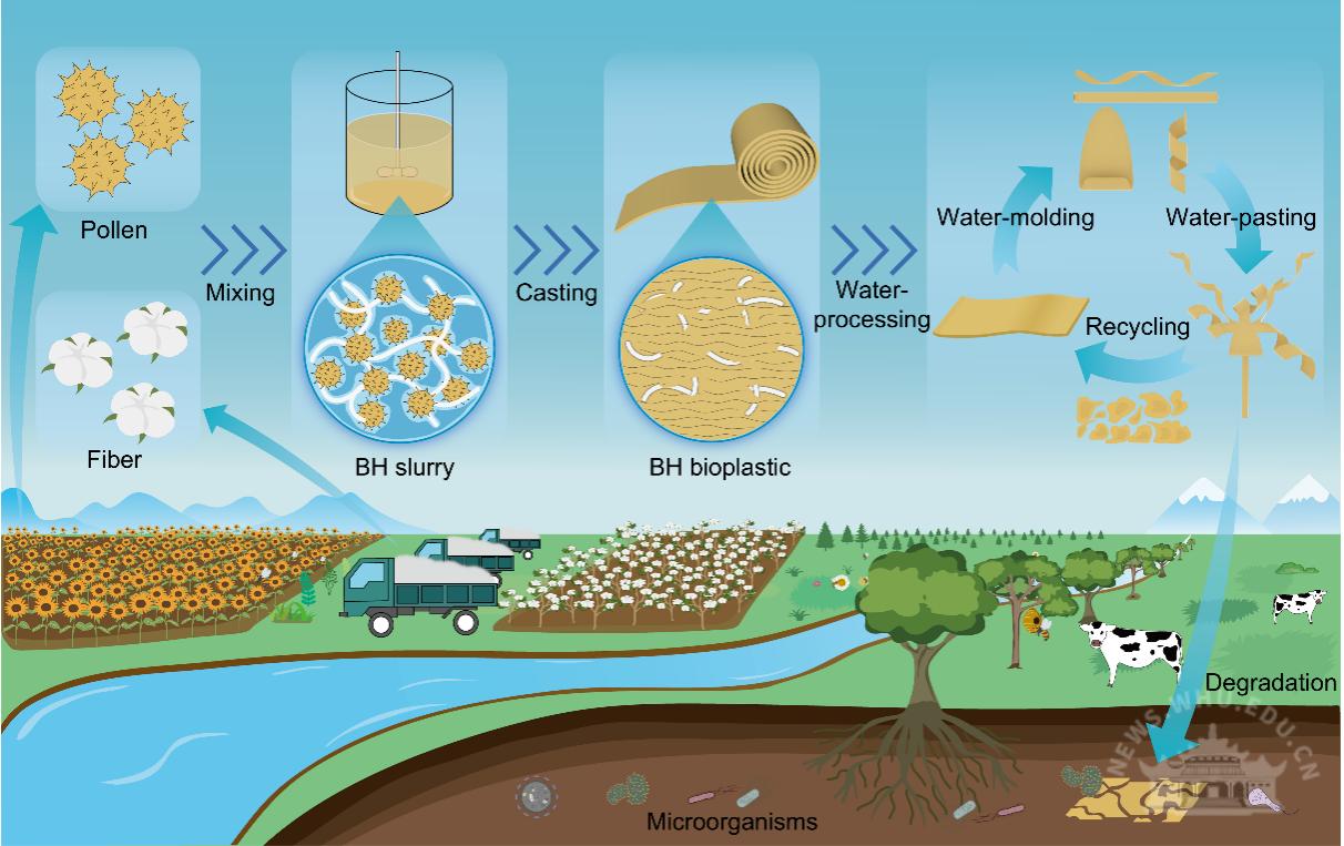 微塑料污染的根源在于不可降解的石油基塑料。因此,团队进一步探索花粉颗粒的结构可塑性与组装潜力,将其与少量预处理后的棉花纤维混合,借助自然干燥过程,全程无需任何有毒化学添加剂或高能耗热压设备,开发出一种具有优异力学性能和环境友好性的新型生物塑料。
