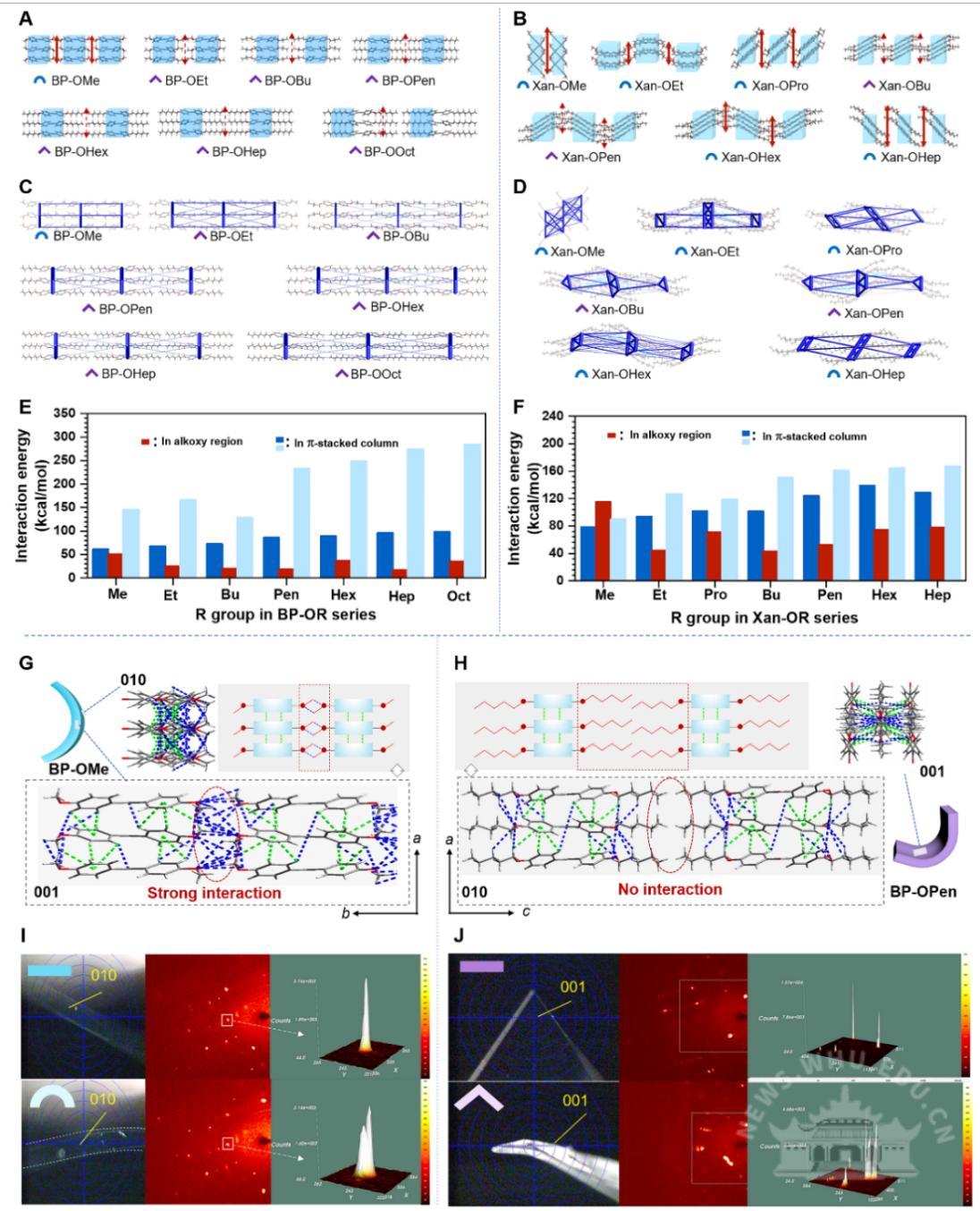 图2 有机室温磷光弹/塑性晶体(BP-OR和Xan-OR系列)的分子排列、不同区域的相互作用能量分布、具体的分子间相互作用,以及弯曲前后衍射点变化情况