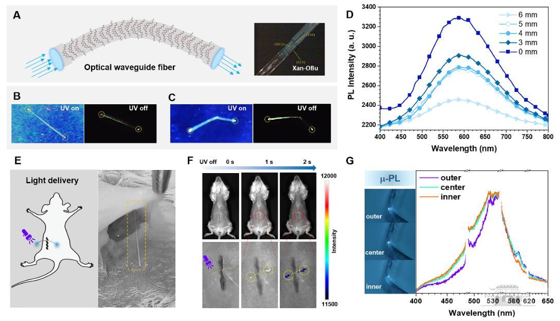 图3 室温磷光塑性Xan-OBu晶体的光波导性质及其在生物体内的光传递应用