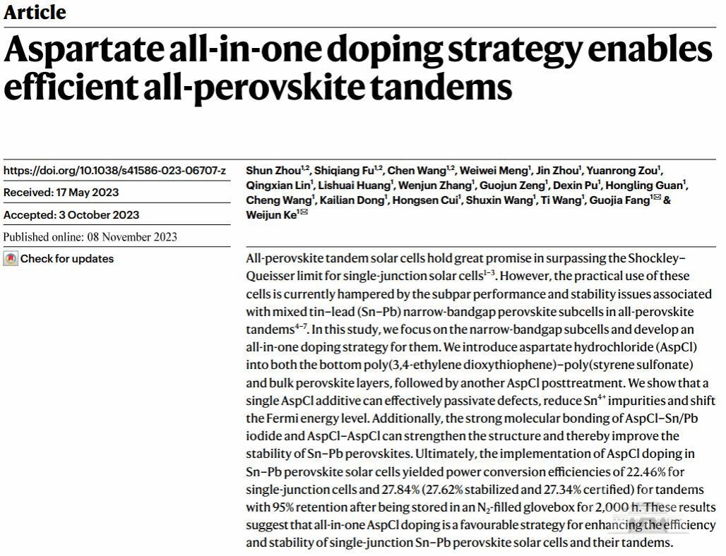 tandems”(《天冬氨酸盐一体化掺杂策略实现高效全钙钛矿叠层电池》)。