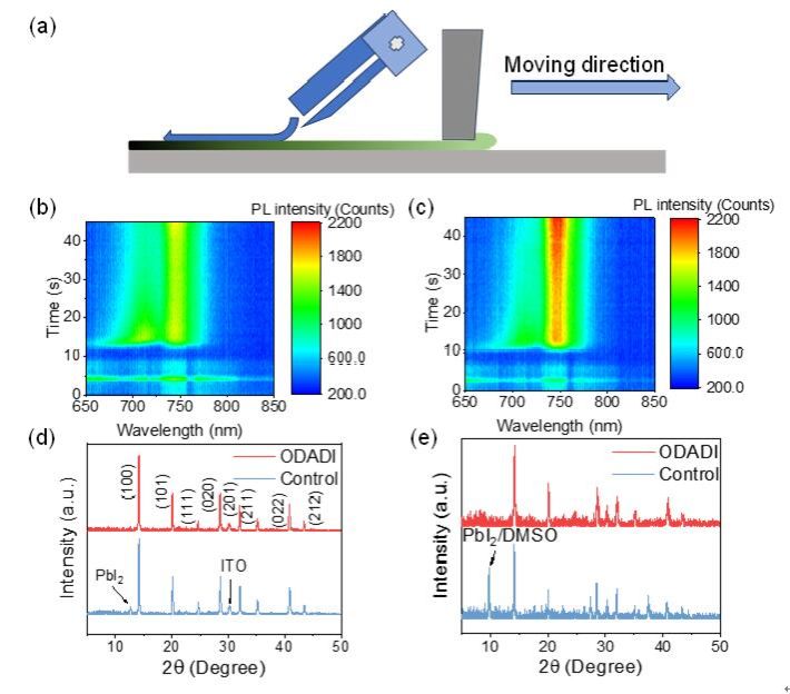 宽带隙钙钛矿通过调节带隙,可以与窄带隙太阳能电池构建叠层电池以克服单结钙钛矿太阳能电池的Shockley-Queisser限制。然而,宽带隙钙钛矿电池中仍然存在严重的非辐射载流子复合和较大的开路电压损失。该项研究使用原位光致发光测试来监测钙钛矿涂层的中间相演变和结晶过程。通过掺杂长碳链分子辛烷-1,8-二铵二氢碘化物(ODADI)来制备高效稳定的宽带隙钙钛矿太阳能电池。研究发现,在带隙为1.67