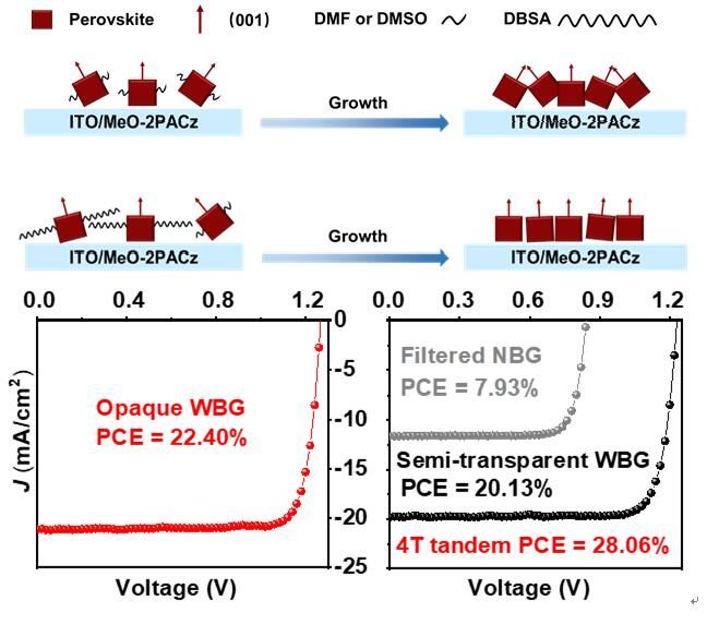 除了窄带隙锡铅混合钙钛矿,构筑全钙钛矿叠层电池还需要高性能的宽带隙混合卤素钙钛矿。然而,宽带隙混合卤素钙钛矿电池的严重的开路电压损失(VOC)和光致卤化物相偏析是领域内的共性挑战。鉴于此,作者提出了一种通过在钙钛矿前驱体溶液中引入十二烷基苯磺酸(DBSA)分子的方法,大幅度提高了宽带隙钙钛矿的VOC和稳定性。使用该方法能明显增大宽带隙钙钛矿薄膜的晶粒尺寸、优化结晶取向、钝化晶体缺陷、有效抑制光致相偏析和抑制非辐射复合等。将1.66 eV带隙的宽带隙钙钛矿太阳能电池的VOC损失降至0.39